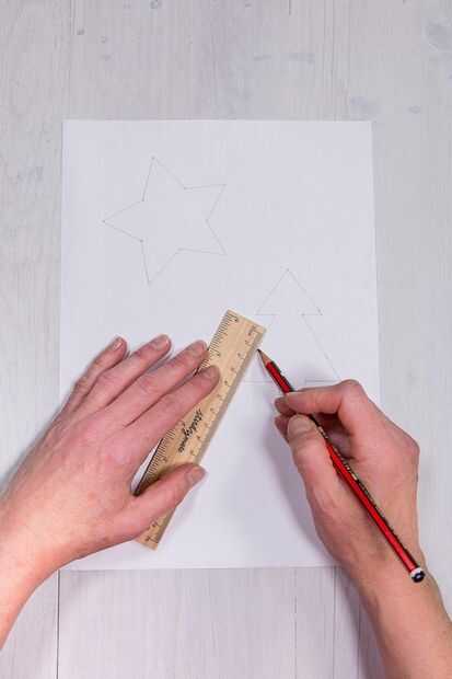 Hay 4 formas para hacer – un árbol, un círculo, una estrella, un hexágono. La estrella y el árbol se hacen con las plantillas, el círculo y hexágono se hacen con los tarros. Dibujar una estrella y una forma de árbol en papel. Usar una estrella de 5 puntero y una forma de simple árbol. Marcar con puntos y unir los puntos con la regla. Cortar estos.