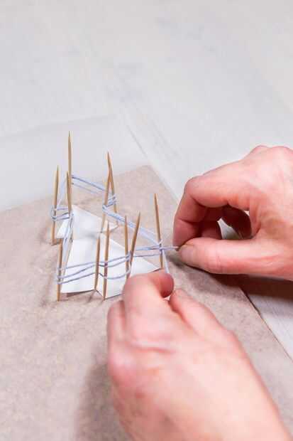 Enrosque la cuerda alrededor del marco, enhebrado sobre un palillo de dientes y detrás de la siguiente, y luego sobre otro. Esto crea la tensión del tejido y la forma. Se dará cuenta de si han perdido un punto de palillo de dientes porque no aparece la forma. Después de la primera vuelta, continuar 3 o 4 rondas. La nueva ronda hará una nueva capa. Empuje la cadena hacia abajo por lo que no quedan huecos entre las capas. Hacerlo por lo menos de 0,75 cm de ancho o continúe envolviendo la cadena es más ancha (más de 1cm de ancho). Mantenga lo enseñado y atar en un nudo.