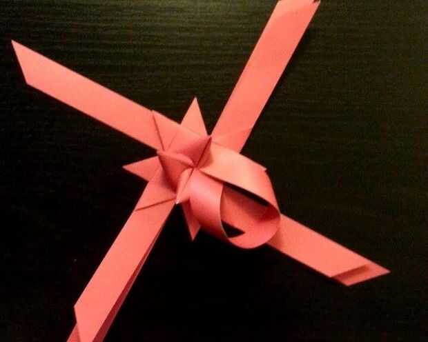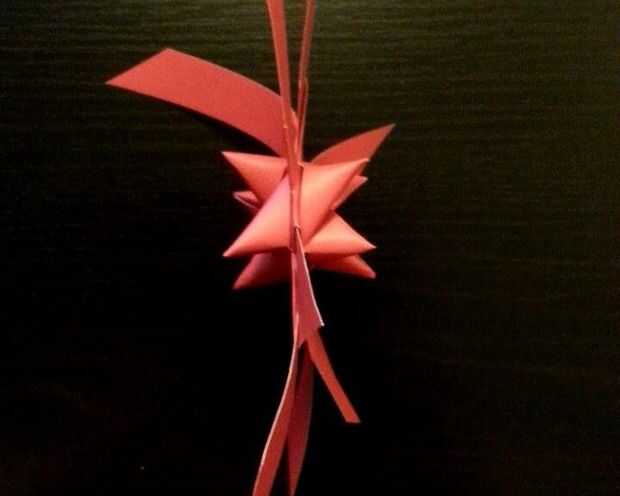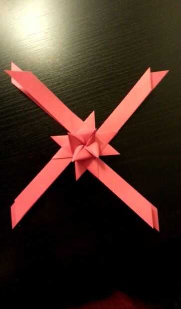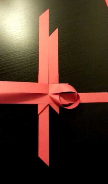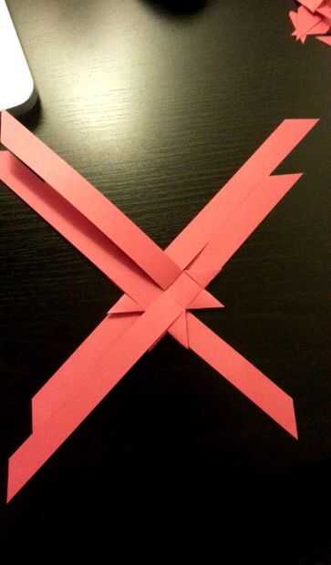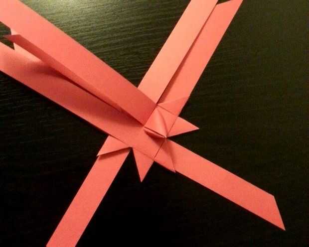 La vuelta la tira hacia atrás y tire de ella bajo la Plaza de la tira inclinó sobre al principio. Tire con cuidado y acabarás con un triángulo 3D... cosa. Hacer esto a los otros tres tiras así - agache la 2ª tira y doblar el 1 º en forma triangular antes de empujar a través de la Plaza bajo la tira de 2...