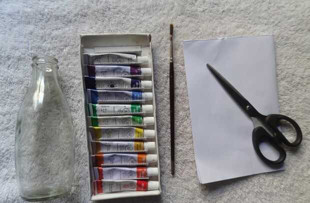 Usted necesitará una botella de vidrio o un frasco de vidrio, pinturas de color, pincel, papeles de carta (blanco o usted también puede usar papeles de carta de colores) y tijeras.