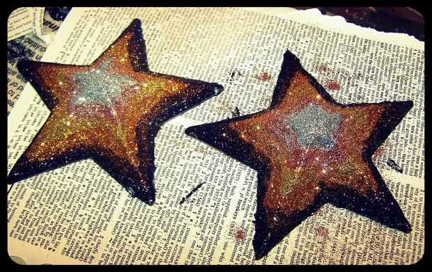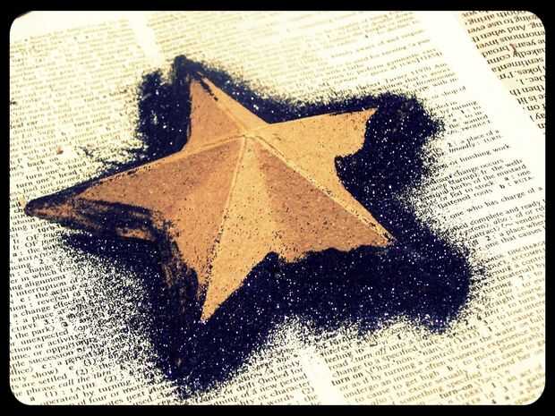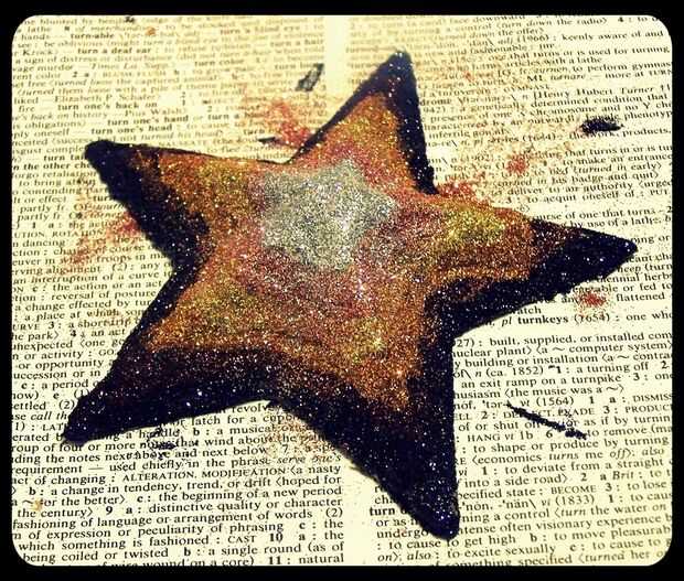 Una vez que el pegamento mod podge alrededor del borde, poner algún brillo en ella! Ahora, este es su árbol topper para que pueda decidir cómo quiere su estrella para ver. Tuve 6 brillos que todo tipo de emparejados entre sí. Así que decidí desaparecer de oscuro a la luz. Usted puede hacer su estrella en 1 color, 4 colores, o lo que quieras.