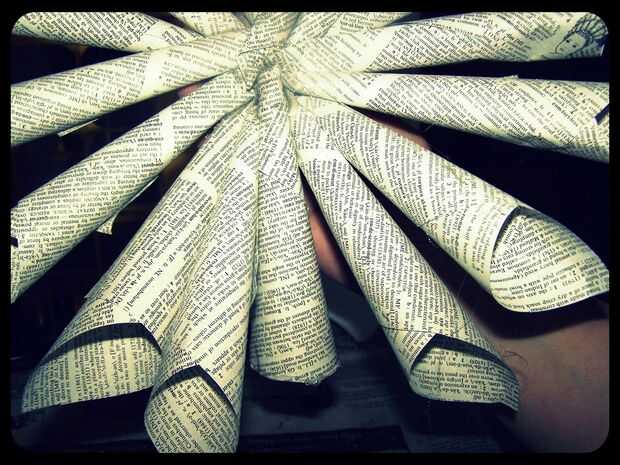 Una vez que lo hace necesita hacer y colocar el cono que permite esto al pie de su árbol. Tomar dos trozos de páginas de diccionario y pegar las esquinas con un punto de pegamento caliente. Luego enrollar en forma de cono y pegamento. Recorte la parte inferior (la apertura) para que los bordes están algo incluso. ahora para hacerlo más resistente capa dentro de la abertura con pegamento caliente. (Pido disculpas que hay hay fotos de este proceso, pero era imposible sostener una cámara y hacer esto).