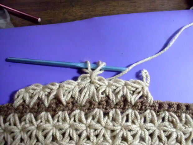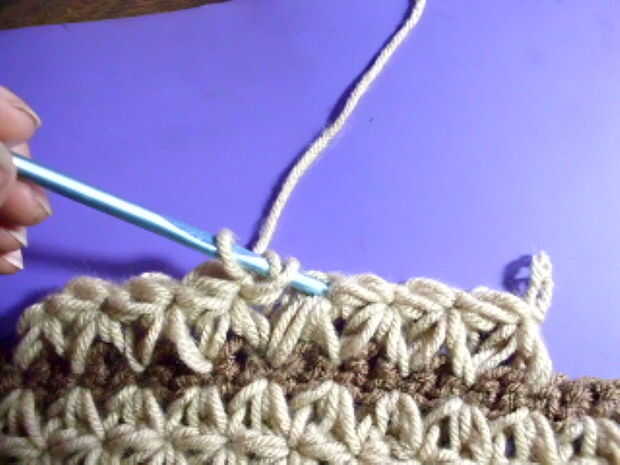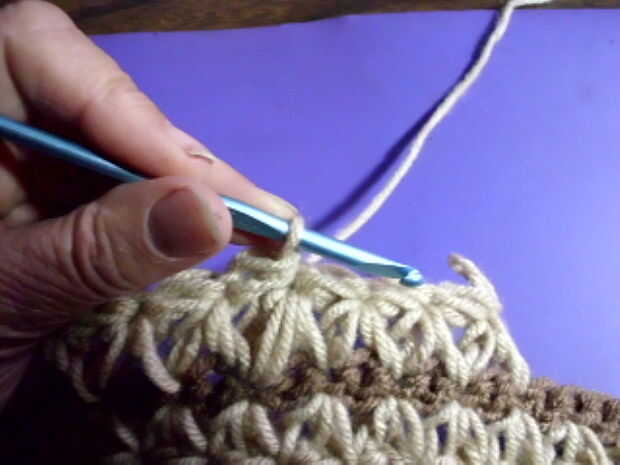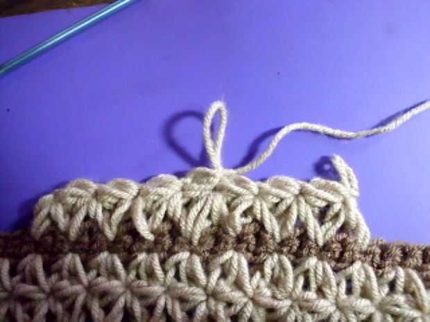 7c 7d YO y tire del lazo del punto. 3 lazos en el gancho. Ahora entrar la primera puntada de sujeción al principio de la fila y puntada de resbalón los 3 lazos sobre esto.