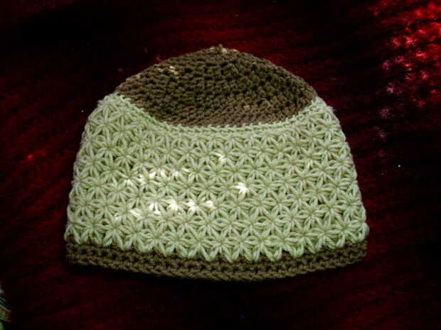 6 esta puntada puede trabajar bien 'en la ronda' también. Aquí es un sombrero que hizo ir con el pañuelo en que he sido mostrándole.