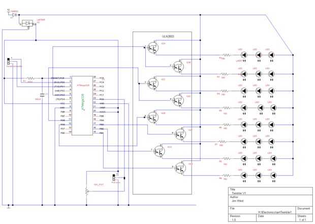 El circuito twinkler está construido alrededor de un chip AVR ATMega328, con un chip de array de Darlington ULN2803 utilizado para manejar el LED.