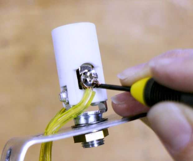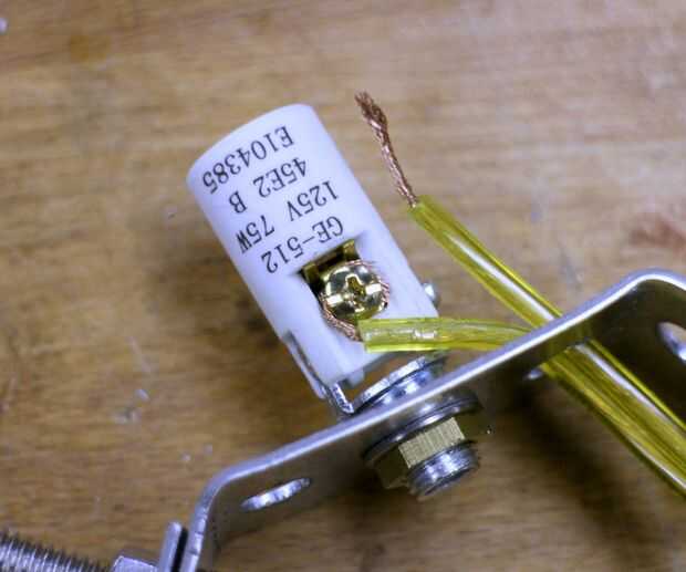 A partir de la primera toma a la izquierda del perno, poner el primera 6" pieza para arriba a través del orificio a la derecha de la toma para que el lado liso de la médula (la parte 'en caliente') se conecta con el tornillo de latón. La parte acanalada de la cuerda (el lado 'neutral') debe guarnición para arriba con el tornillo de níquel en la parte trasera. Gire cada extremo para hacerlo más fácil envolver alrededor de los tornillos.