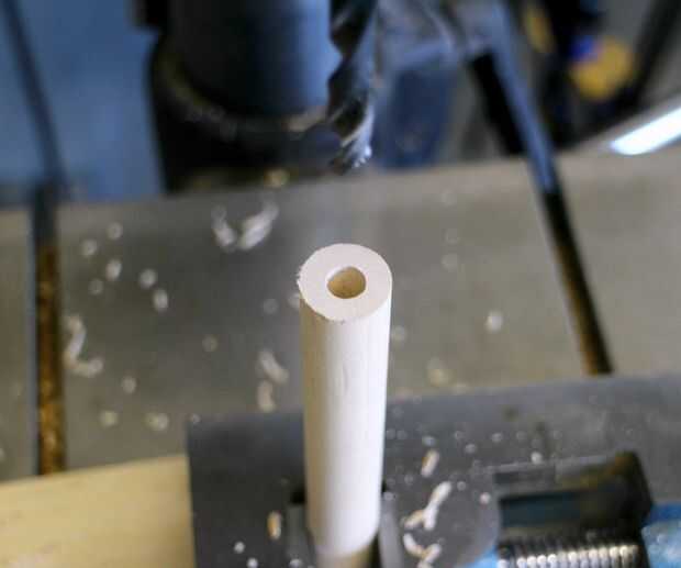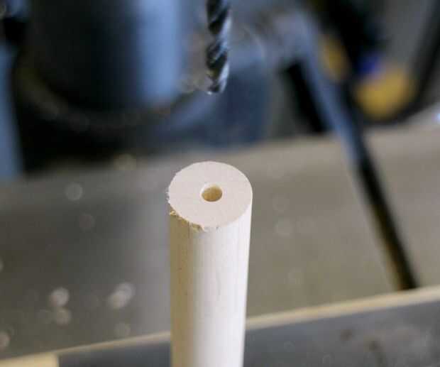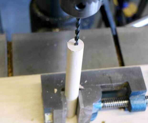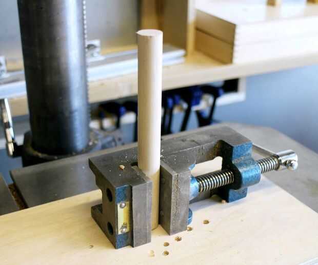 Coloque la espiga vertical en un tornillo de banco mesa pequeña que esté a su lado. Esto tenga en perpendicular a la cama de la prensa del taladro y darle un agujero perfectamente recto.