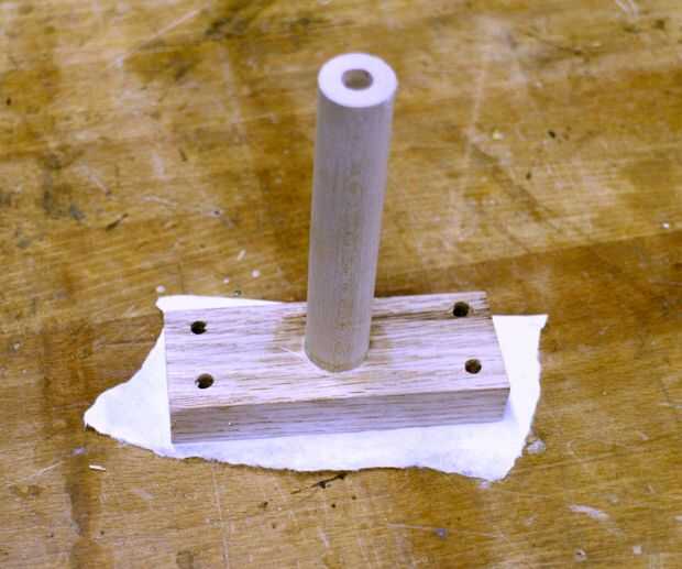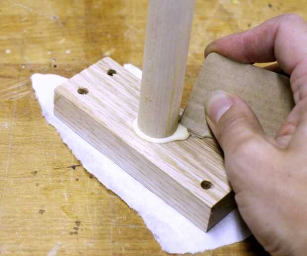 Poner pegamento de madera en el extremo no perforadas de la espiga y presiona en el agujero en el bloque. Permiten al menos 2 horas secar.