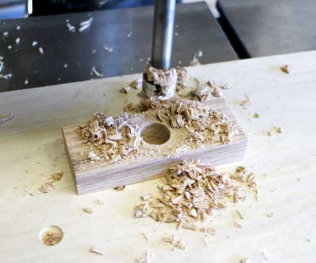 Utilizar un 3/4" forstner broca para taladrar un agujero para la espiga en el centro del bloque.