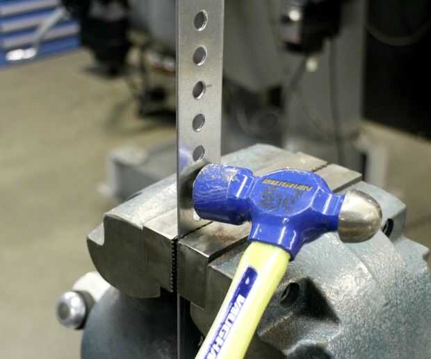 Si no tienes un vicio y van a la ruta de la abrazadera/de la tabla, utilizar la plaza para hacer que la barra esté perpendicular al borde de la mesa antes de sujeción hacia abajo. Una vez fijada la tabla, usar el martillo para golpear la parte saliente de la barra hasta que haya alcanzado el ángulo deseado.