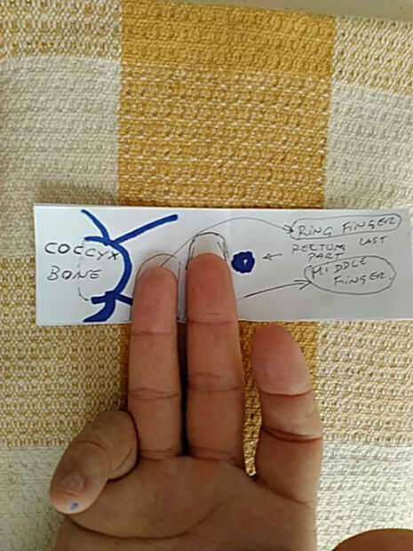En esta foto se puede ver la posición de los dedos específicos – el dedo anular y el dedo medio. Al sentarse en su inodoro, coloque el borde de dedo anular como si realmente fue conmovedor tu coxis lateralmente y el dedo medio tiene que estar tocando el anillo así. Luego presionan contra la parte inferior, por supuesto debe utilizar un trozo de papel para evitar cualquier "accidente indeseable" mantenerse totalmente limpia. Usted sentirá que las heces secas que bloqueaba al instante se pone en marcha hacia fuera finalmente también sin ningún tipo de dolor, también sin sangre.