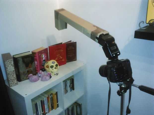 La lógica es simple, puedo estar muy duras pero muy selectiva con mis flashes apuntando directamente hacia el objeto y zoom a 80mm, por otro lado me permite "soltar" la luz en algo a una longitud decente, el ángulo recto significa también que puedo inclinar el arreglo entero fuera de cuadro para el extremo más ancho del tiro sin perder el efecto. Si era recto tendría que estar apuntando directamente a la cosa.