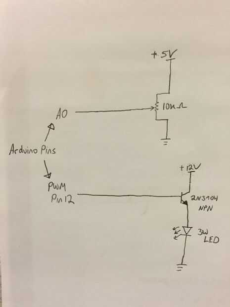 Para controlar la frecuencia de la luz estroboscópica de LEDs se utiliza el microcontrolador de Arduino para manejar esto. Usé un potenciómetro para enviar una tensión variable a la clavija de entrada analógica en el Arduino. Desde aquí el Arduino serán capaces de enviar otra tensión de salida de un pin que van desde 0-5Volts. Esta gama de la salida se conectará a la base de un transistor NPN. Este transistor se utiliza para encender y apagar el LED en diferentes frecuencias.