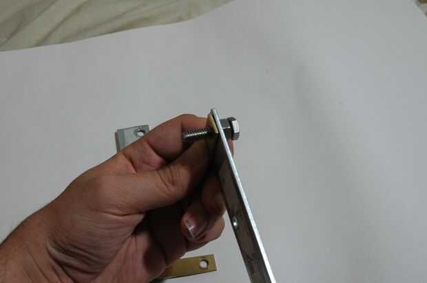 Ahora toma un perno y coloque una tuerca en el perno y girar todo el camino hasta la base del perno. Esto permite que el perno para sentarse a ras contra la parte inferior de la placa base. Si no desea utilizar una tuerca para esto puede utilizar arandelas. Tome el tornillo y palillo para arriba de debajo de la placa base a través de la placa base y la placa de latón. Coloque una tuerca en la parte superior y apriete hacia abajo. Hacer esto para los 4 orificios de intersección de las placas de latón.