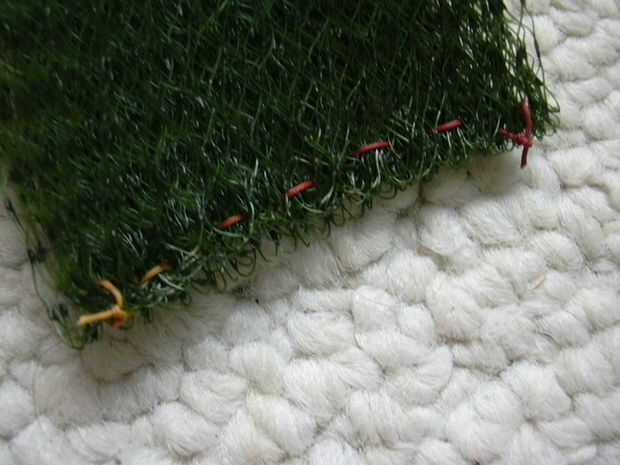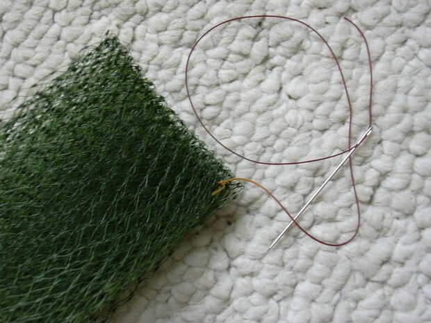 Coser los lados enfrente de la parte doblada de la almohadilla. Corte una longitud de línea de pesca sobre tres o cuatro veces el ancho de la almohadilla e hilo en la aguja, si tienes uno. Los orificios de la malla son tan enormes que usted probablemente ni siquiera necesita una aguja, pero hay un montón de capas que pasar así que si tienes uno probablemente facilitar el proceso. Empezar haciendo un nudo en un extremo, coser por el costado (no cerrar hasta el borde; para durabilidad) y al final con un nudo en el otro extremo. Intenté mantener todo casi apretado durante la costura, pero una puntada más flexible probablemente funcionará así.