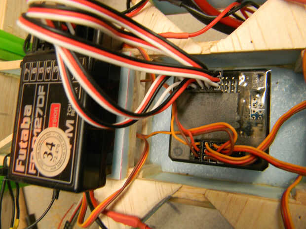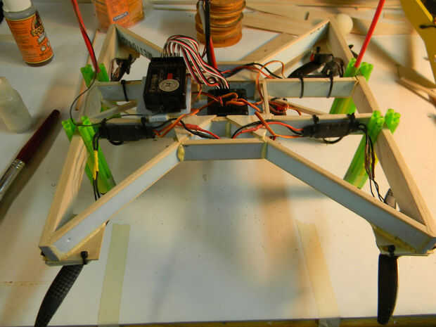 Mi controlador de vuelo y receptor de radio fueron montadas en el subsuelo usando la cinta doble cara espuma. Más controladores de vuelo están montados tan cerca al centro de la estructura como sea posible. El también tiene que enfrentar la dirección correcta. En la mía, el receptor de radio es la parte delantera. El modelo de espuma azul en los cuadros anteriores muestra todos los componentes básicos. Sólo utilicé lazos zip para instalar los controladores de velocidad.