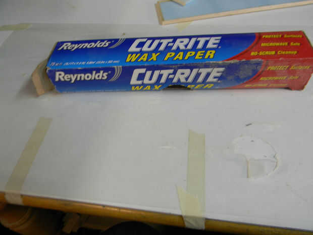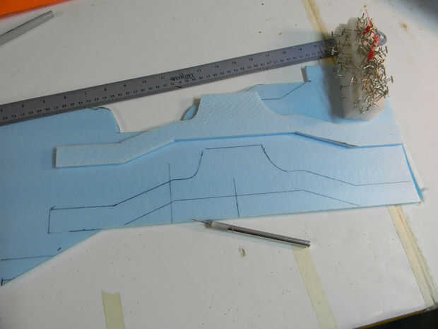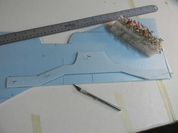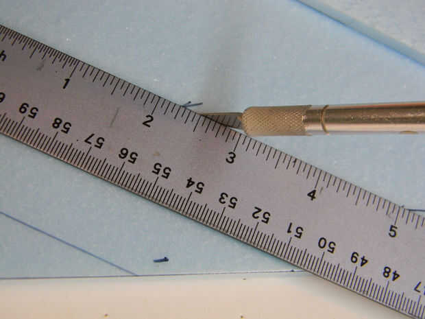 Aquí corté las piezas grandes de espuma utilizando la regla de acero como guía para un corte recto. El cuchillo X-acto muy agudo es ser tan cuidadosa y deliberada con cada corte. Usé un tablero espuma del arte como superficie de trabajo y cubierto con papel de cera para evitar que las piezas se adhieran a la Junta de trabajo.