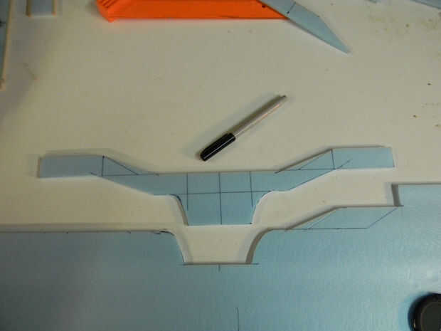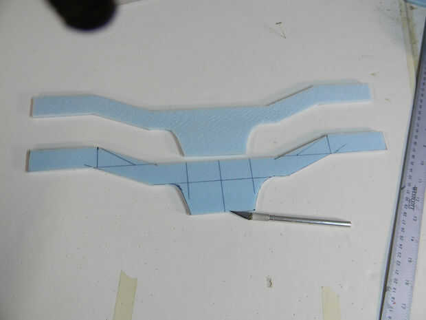 Las partes principales consisten en 2 asambleas de brazo del motor de "Cuernos de toros", los lados de la "caja" 2 y a las piezas superior e inferior y 4 piezas de brazo diagonal del motor. He medido estas piezas hacia fuera y corte de la hoja de la espuma. Yo generalmente Pele la hoja de barrera de vapor claro después corté cada parte. Después corté 1 cuernos de toros, I lo había establecido y localizar en la siguiente pieza de espuma y recortar demasiado.