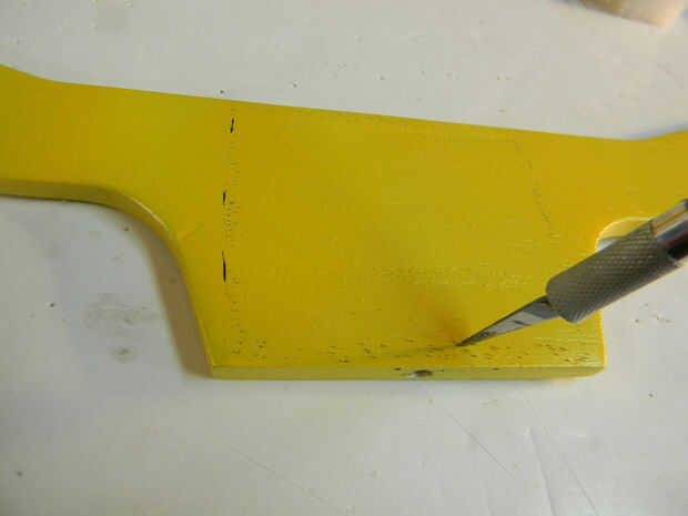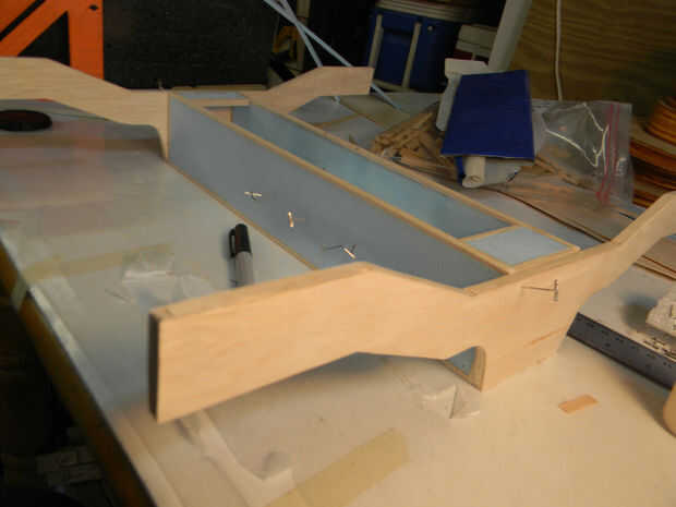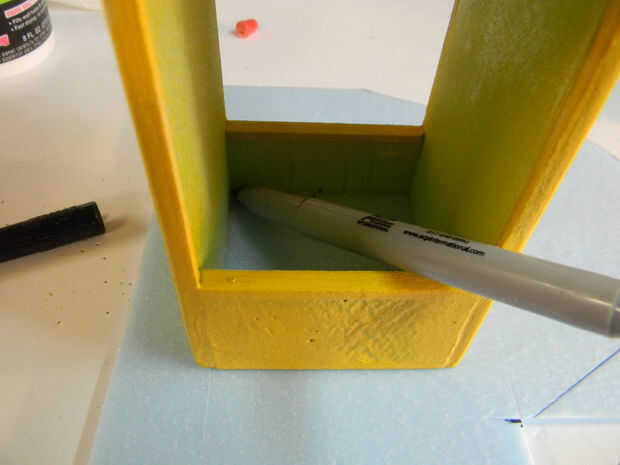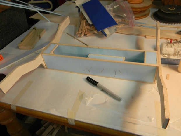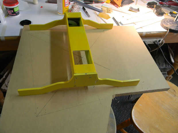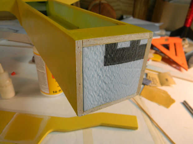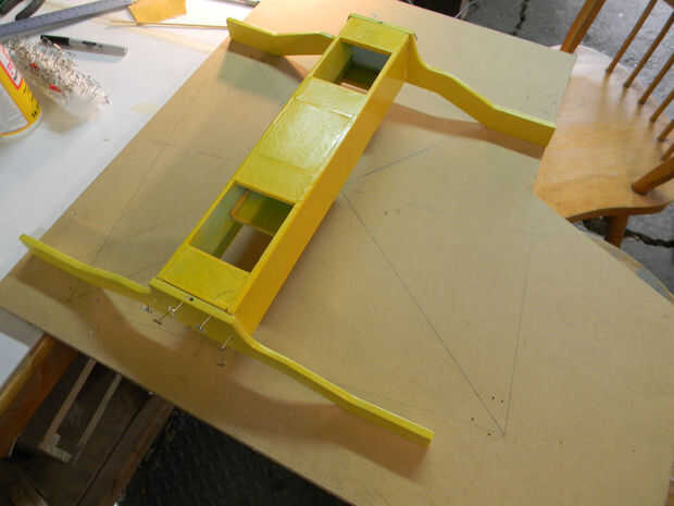 En este paso pegué un trozo de espuma cuadrado en el extremo de la caja, cerrando los extremos. Después de que fuera seco, pegué un extremo a uno de los cuernos de toros. Una vez que esto fue asegurado con pernos, giré boca abajo y pegan los otros cuernos de toros hasta el otro extremo y aseguró también este extremo con pernos. Puse la Asamblea boca abajo y comprobar que los extremos de los cuernos estaban en la superficie del edificio. Esto es importante para la alineación del motor. Tengo que liberar un extremo y ajuste hasta los cuernos de toros set plana. Yo estaba experimentando con pintura por lo que algunas partes ya se pintan y parecen fuera de secuencia.