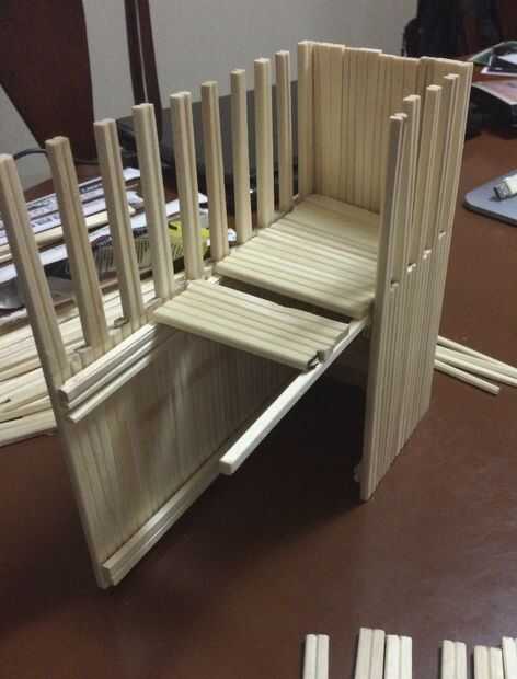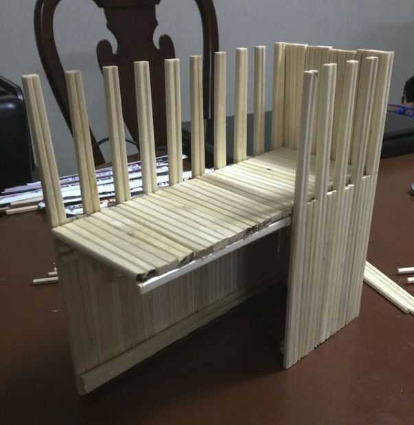 Es la pared lateral se compone de 8 par de palillos. Otra vez, alterne los pares para mantener los ángulos. Puede utilizar dos de los cortes del paso 1 como travesaños. Las paredes serán superpuestas así que encolar los travesaños por debajo y por encima de los travesaños de paredes primera.