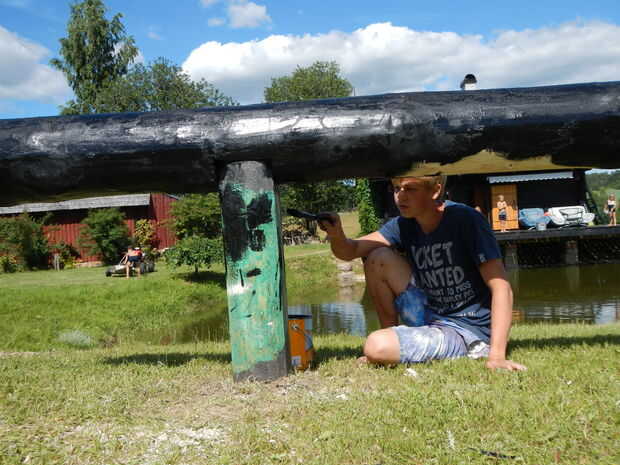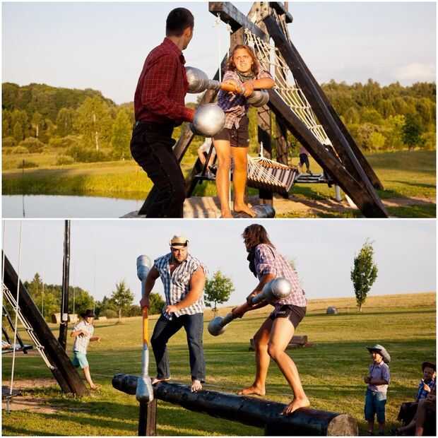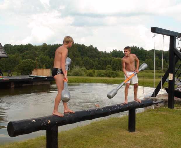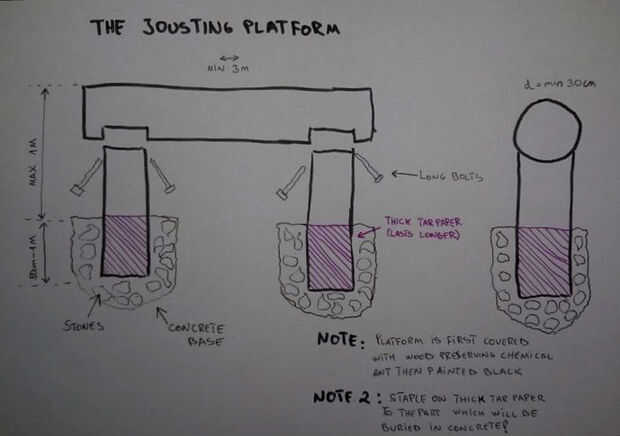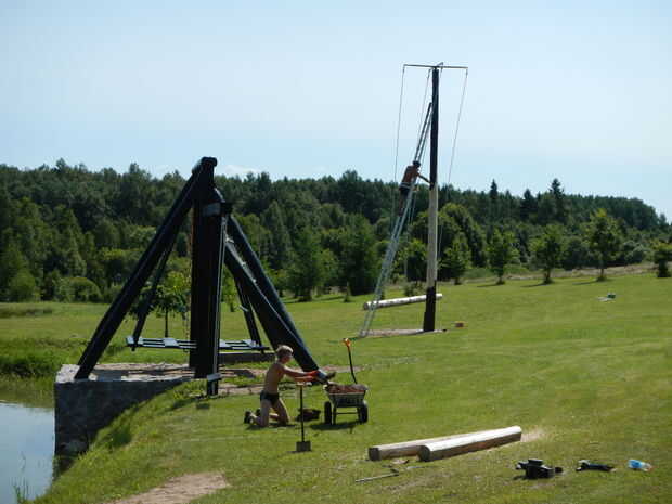 Construí esta para que la gente podría se retan a una lucha divertida, no causar daño. La estructura en sí es super sencilla. Sólo dos piernas y un registro horizontal grueso. Una vez más comenzó con un agujero grande con una base de hormigón. Esto podría hacerse también sin el hormigón pero no deseó a riesgo con la posibilidad de oscilación en los postes verticales. He tallado un pequeño rebaje en el registro principal y había conectado a las patas con unos pernos. Hasta este día se llevó a cabo para arriba perfectamente. La plataforma está cerca de la charca hace que sea aún más divertido porque muy pocos chicos realmente han caído en el agua.