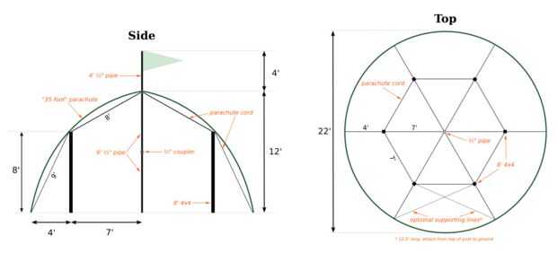 El poste de centro está hecho de dos tubos de 6' 1/ 2" acero. Fui con dos segmentos de tubería y un acoplador porque se encajan en nuestra van más fácilmente que un 12' poste o tubo. Los puestos de externos son 8' 4 x 4 y solo caben en nuestra camioneta. El asta de la bandera (opcional) en el techo también se puede conectar con otro acoplador de tubo.
