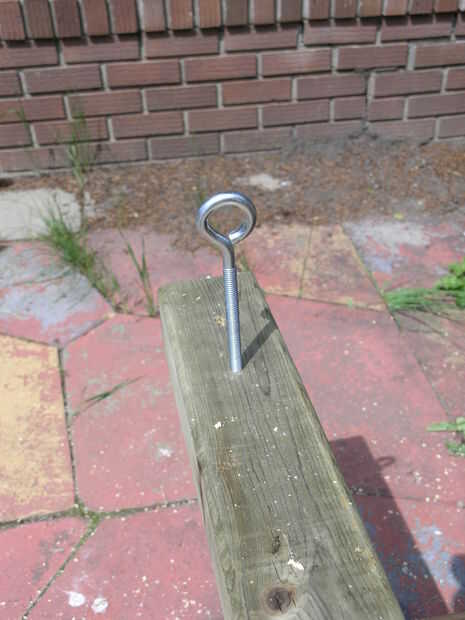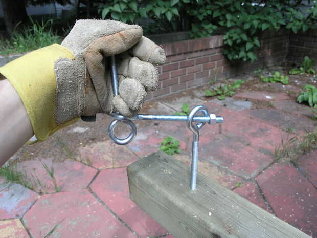 Taladre dos agujeros de 5/16" 2.5" y 5" de la parte superior de cada 4 x 4. Aprovechar los agujeros apretando un perno de ojo en cada uno. Atornillar los pernos de ojo es un poco más fácil si pega algo a través del ojo, como un pedazo de varilla u otro perno de ojo. Se puede ver una simple manivela que aparejados para arriba con algunos de los pernos de ojo extra.