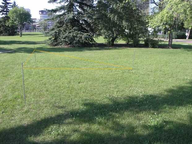 Una buena manera de conseguir las distancias y los ángulos correctos es crear un triángulo equilátero de la cuerda que es 7' un lado. Haga nudos en las esquinas del triángulo y coloque el triángulo en la estaca centro, colocando un nudo detrás de la estaca. Estirar el triángulo y colocar barras en los nudos en las esquinas. Tire el triángulo de la varilla y deslizarla sobre el polo del centro y una de las nuevas apuestas. Estirar nuevamente el triángulo y colocar una estaca en el nudo libre restante en el triángulo. Repita para cada nuevo juego. Tenga en cuenta que enfrente de rebar estacas deben formar una línea recta a través del centro.