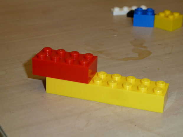 Tomar un ocho rojo punto Lego y compensar el Lego por un punto y fije a la parte posterior del Lego amarillo.