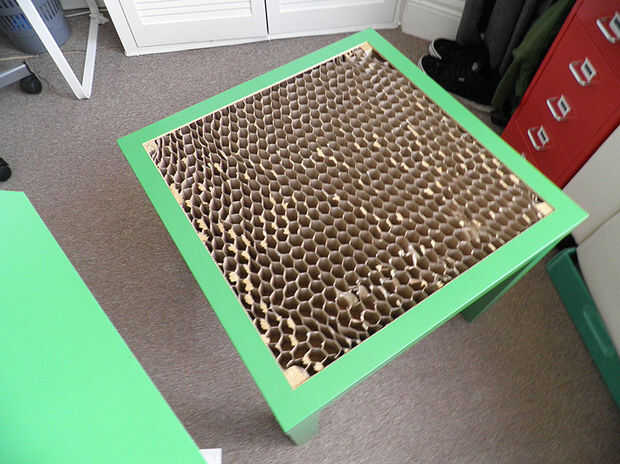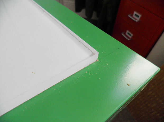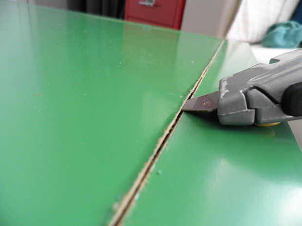 -Utilice una hoja nueva de stanley y una regla de metal antideslizante para cortar cuidadosamente a través de la mesa. Ser paciente porque tarda bastante unos cortes para romperse a través.