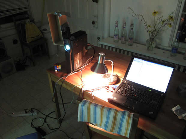 Para el montaje, se puede utilizar prácticamente cualquier cosa que sea convenientemente estable. He utilizado todo, desde proyector spider monta, en escritorios con cinta y cartulina, para soportes de música. El objetivo principal es asegurarse de que la geometría no cambia mientras que usted está capturando cada patrón.