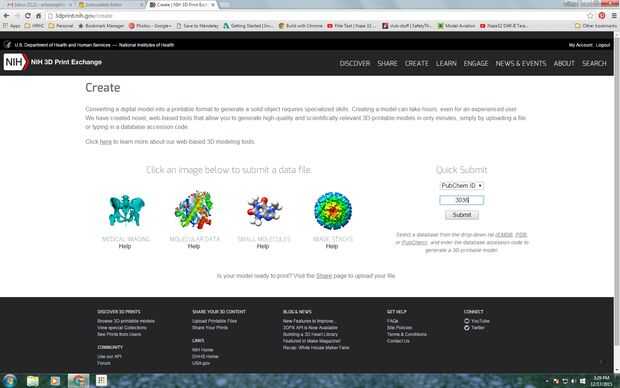Siguiente, cabeza encima al NIH Intercambio de impresión 3D. Configurar una cuenta, luego haga clic en el icono de "Crear" en la Página principal. Seleccione la opción «PubChem ID» en las cajas "Enviar rápido" y pegar el número de identificación de PubChem en la caja vacía. Haga clic en 'Enviar'. En pocos minutos usted recibirá un correo electrónico indicando que el modelo está listo. El compuesto se listarán debajo de configuración de tu cuenta. Haga clic en la imagen de su compuesto. Haga clic en el icono de "Descargar" y se verá un número de diferentes tipos de estructuras, así como varias opciones para distintos tipos de archivos. El archivo "PubChem-XXXX-bas.stl" es el modelo tradicional de la bola y del palillo. El "... sticks.stl" archivo es los palillos sin las bolas. El "... Archivo CPK.stl"es el modelo de la calota o relleno de espacio. Haga clic en el archivo que desea descargar.