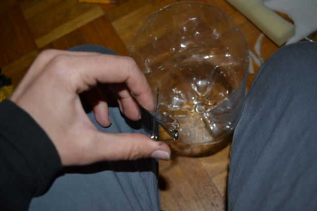 hacer agujeros con el perno de seguridad todo alrededor del borde de los 2 pedazos de botellas. 1/2 cm de distancia.