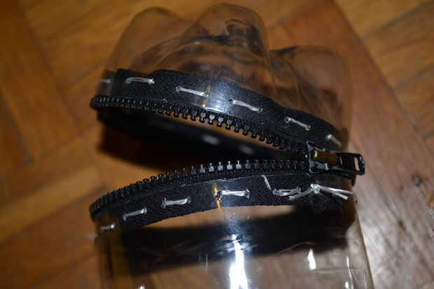 coser cremallera con hilo dental (usé ' couse es realmente fuerte), usando los agujeros que hiciste antes con perno de seguridad.