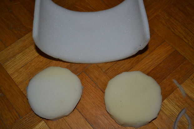 cortar el material esponjoso: 2 círculos de la circunferencia de la botella y una pieza rectangular que se ajuste a la parte lateral de la botella.