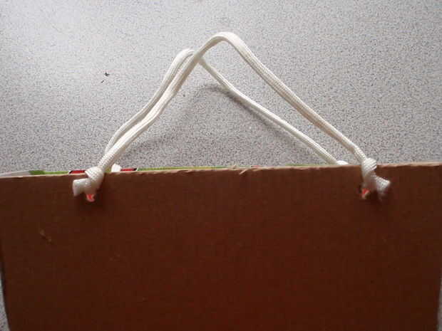 Meter cuatro orificios, dos a cada lado y atar la cuerda a ellos.
