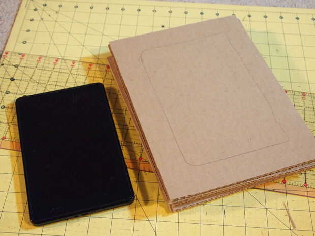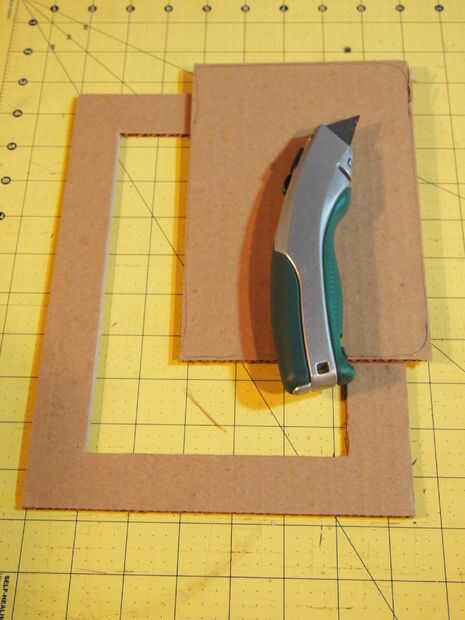 Después de cortar las piezas, luego tomé cinco fuera de la pila. En la primera, remonta la pastilla otra vez dejar aproximadamente 1/4 de pulgadas de un espacio de exceso en el área trazado - y recorte. Me con 10 1/4 por 7 1/2 pieza con un rectángulo grande cortado al medio a la izquierda. Utiliza ese pedazo y ponerlo en otro, remontar el corte hacia fuera de la zona y procedió a cortar de aquél. Repita con los cinco.