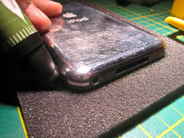 -Trace el iPod en la espuma (debe ser de grosor similar del iPod), cortar con tijeras. Esto evitará que el iPod moverse. Pegar esta pieza sobre la pieza inferior.
