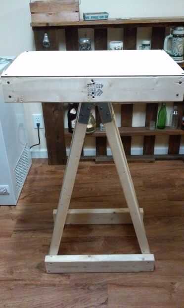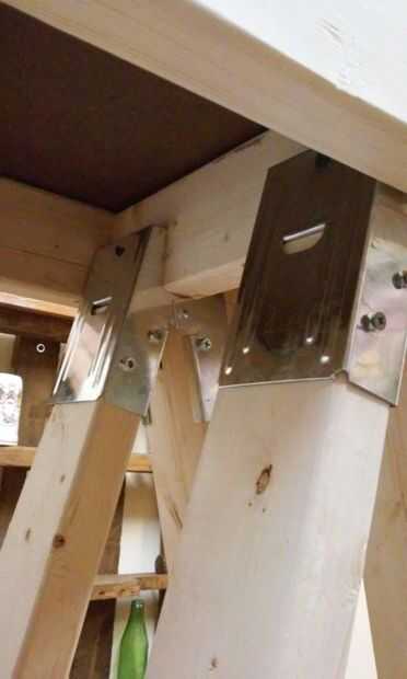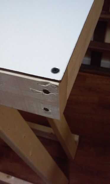 4. Ensamble las patas con los soportes de caballete (siga las instrucciones en el envase). Cortar las piernas y pies para lograr la altura deseada; la altura total recomendada es igual a la distancia desde el codo hasta el suelo.
