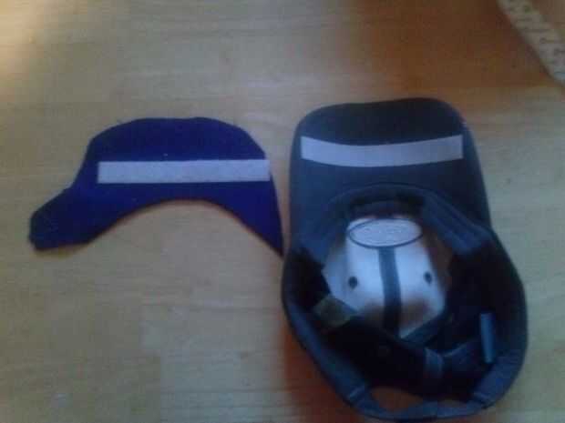 Corte una tira y coloque un lado en el interior de su sombrero. Tengo pereza y acabo de hacer una tira continua, pero si lo desea puede utilizar múltiples piezas.