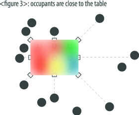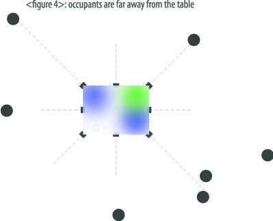 Puesto que la lámpara tiene doce LEDs respondiendo a cuatro sensores, la mesa así puede tener hasta cuatro tonos diferentes al mismo tiempo. En una habitación con movimientos dinámicos de los ocupantes, la lámpara cambiará constantemente sus colores. Por el contrario, en una habitación con movimientos más bien estáticas de los ocupantes, los colores de la lámpara será mucho más constantes. Figuras 3 y 4 muestran cómo se verá la tabla como dependiendo de la ubicación de los ocupantes.