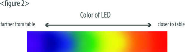 La lámpara tiene un total de cuatro / sensores de R, cada uno en una ubicación diferente de la lámpara. Tres LEDs (rojo, verde, azul) son designados por cada sensor y responderán al nivel de actividad que detecta el sensor. Una vez que el sensor detecta cualquier persona dentro de su gama, el LED del sensor correspondiente emitirá diversos colores de la luz dependiendo de la distancia entre él y la mesa. Más lejos el ocupante es alejado de la mesa, el LED emitirá colores "fríos" como el azul. Más cerca el ocupante es la tabla, el LED emitirá colores cálidos como rojo, amarillo, etc (Figura 2).