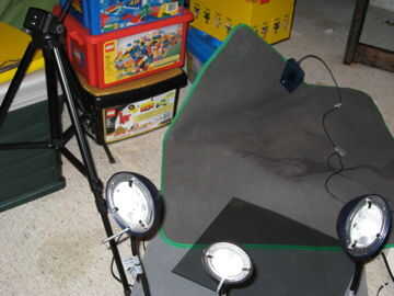 Tres lámparas (dos productos un telón de fondo), un trozo de tela gris (utiliza una almohadilla máximo quebrada de DDR con gris detrás), una lámina de vidrio, tabla (yo usé cajas de lego con una pieza de acero para la tapa), Jels, difusión de papel o rastro de papel (como yo) y un trípode.