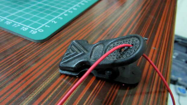 El clip que utilicé fue un clip normal y necesitaba asegurarse de que el cable encaja perfectamente en el clip perforaron un agujero de diámetro 5mm para el trabajo. Usé una broca primero y luego una molienda.