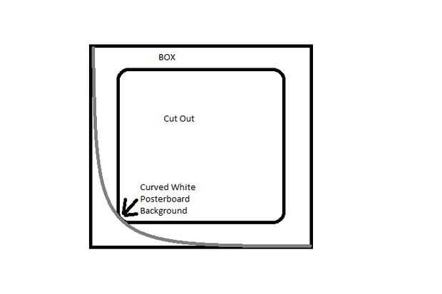 Paso 3 cortar tu cartulina de modo que es tan amplia como la parte posterior e inferior de la caja tratando de no pliegue o doble como la transición de esquina trasera debe ser suave para dar la ilusión de que el fondo es transparente. Pongo un poco de cinta adhesiva en la parte superior y borde delantero para mantener en su lugar pero la parte curva no es compatible.