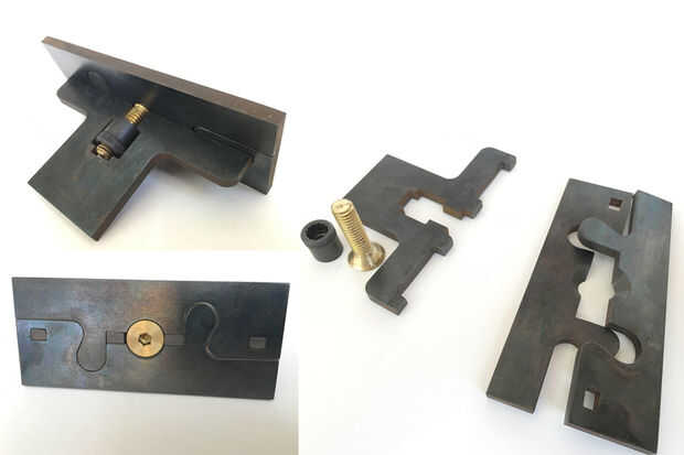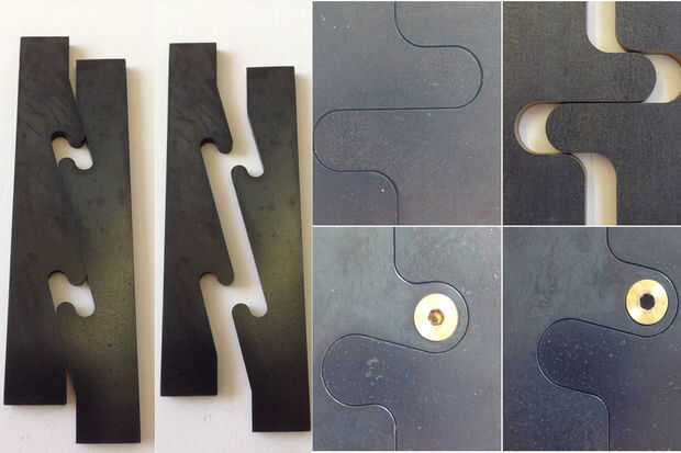 E. tipo de junta más 3-dimensional utiliza un único tornillo de cabeza plana para 'bloquear' todas las piezas juntas - 2 placas superiores de la pieza del rompecabezas empujadas apartes en tensión por el bisel de los tornillos y una pieza perpendicular atar la Asamblea junto con 'espigas'.