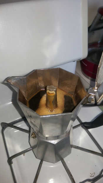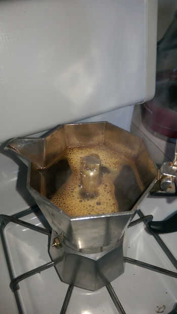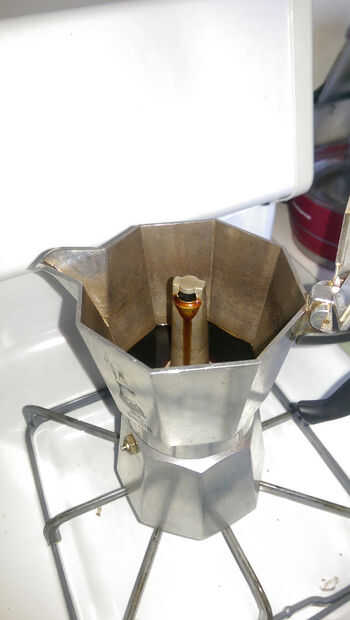 Después de unos minutos en la estufa, café oscuro debe comenzar a rodar hacia abajo el pico central. Cuando el depósito superior es aproximadamente 3/4 completo, el nuevo café que sale de la boquilla a su vez más blanco y burbujeante. También puede ser un sonido de borboteo. Esto es cuando se apaga el fuego y la olla de la hornilla. También debe cerrar la tapa para no quemarse del salpicaduras de café.