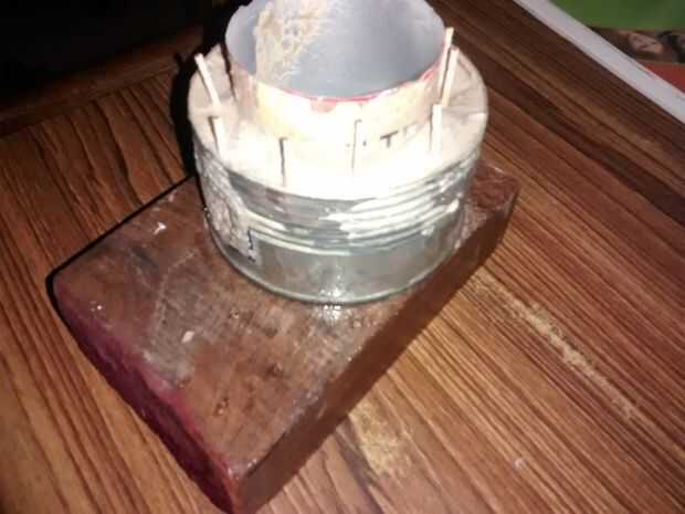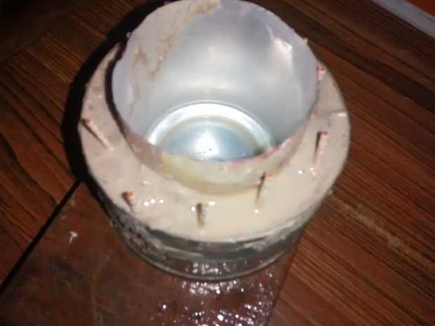 Después de haber completado el paso 2, tomar la pieza de la parte inferior de la cerveza puede y coloque en el centro de la lata más grande puede que se une a la base. Cuando encuentres la posición que usted está satisfecho con comenzar a preparar la mezcla de moldeo. No voy con cualquier proporción fija me a añadido yeso de París y arena en proporción 1:1. Este fue mi mezcla de ignifugación. Yo esta mezcla en un recipiente pequeño y empezamos a añadir poco de agua. Sólo comentarlo y hecho a una consistencia de la masa de pastel, que creo que era casi derecho y salió bastante bien. Vierta esta mezcla en la lata con la lata más pequeña en el miiddle. Añadir un poco de peso a menor puedo yo solo vierte agua hasta que la fuerza de flotación de la mezcla no introducir la lata fuera de su lugar. Una vez que ha hecho que deje el poder para mientras hasta que la mezcla se endurezca. Después de 2 horas mi mezcla fue bastante firme. Fui por delante y añadido un palillo en el centro para dar la mezcla de prueba de fuego de apoyo estructural. Esperar a otro día y debe tener su lista de base de la estufa.