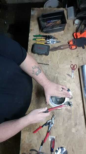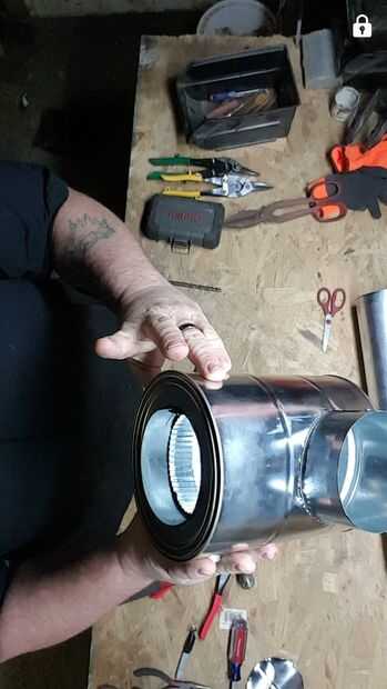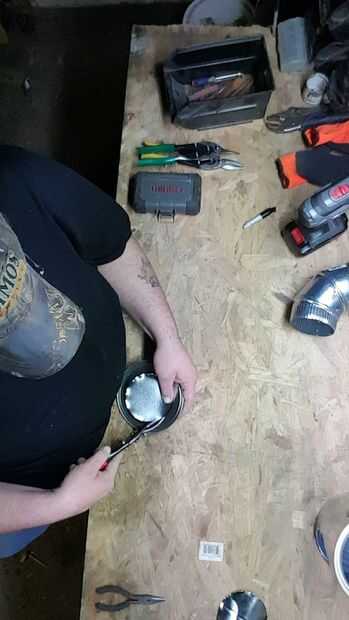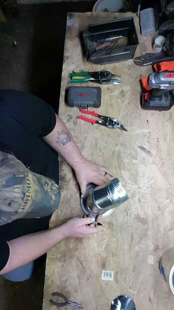 Trazar la tubería sobre la tapa y cortar la misma forma que usted recortar la lata. Tomar la 2' pieza y corte una sección de 2" de la parte inferior, pase por el agujero que usted cortó en la tapa. ** Un paso adicional que usted puede hacer es aislar por verter arcilla barata litera del gatito en la lata alrededor de la elbow.* * lugar de la tapa en y ahora tienes un cohete de la estufa.