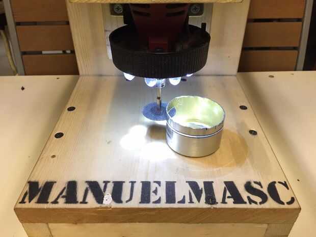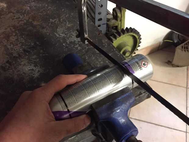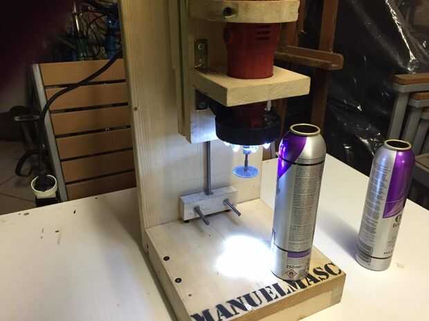 (Como veis en la segunda foto, ya que mi taladro casero no es lo suficientemente alta, tuve que cortar las latas a mano unos 2 cm por encima de las líneas marcadas).